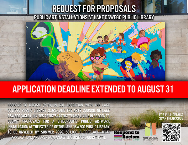 Respond to Racism (RtR), in collaboration with the Lake Oswego Public Library (LOPL) and the Arts Council of Lake Oswego (ACLO), invites artists/artist teams living in Oregon to submit proposals for a site-specific public artwork installation at the exterior of the Lake Oswego Public Library. The installation is to be unveiled by summer 2026. The installation will include interpretive panel(s)